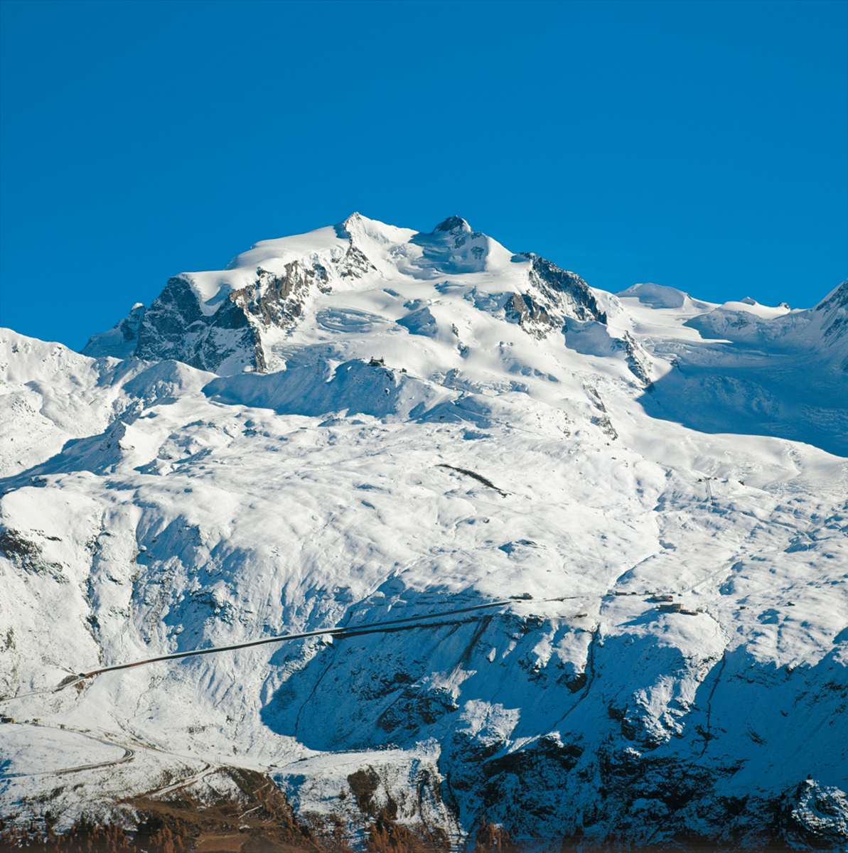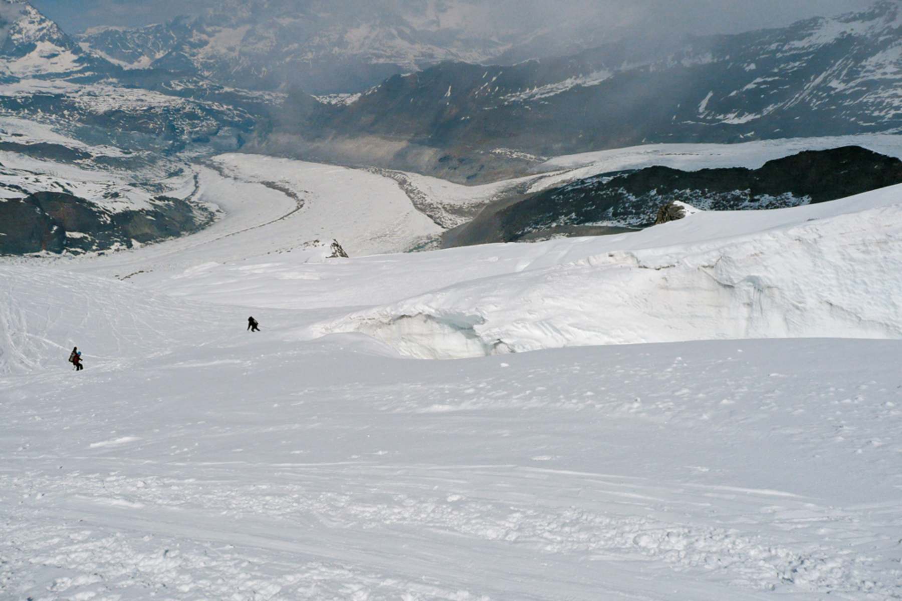 Ist man auf dem Gipfel mit 4.634 m angekommen bietet sich eine fabelhafte Aussicht auf das gesamte Walliser Tal. Und es wartet eine der längsten Abfahrten der Alpen in einmaliger Umgebung – bei entsprechenden Verhältnissen geht es fast 3.000 Hm am Stück hinab bis nach Zermatt!