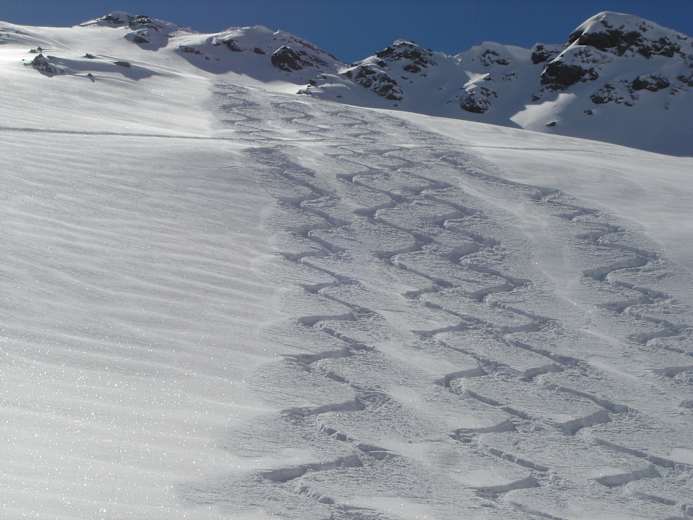 Als Variante kann man den Aufstieg auch über die nahe gelegene Flaggerscharte mit der Marburger Hütte (im Winter nicht bewirtschaftet - Winterraum vorhanden) aufsteigen. Man zieht die Spur vorbei am Flaggersee vorbei steigt bis unter den Gipfelgrat (Skidepot) auf. Über eine kurze steile Rampe erreicht man den Gipfel mit dem neuen Gipfelkreuz. Auch vom Skidepot ist die Abfahrt interessant und vielseitig.