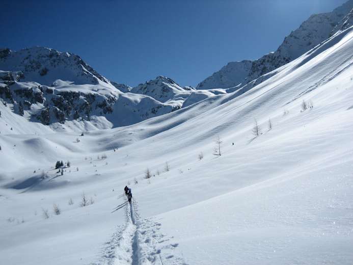 Der Ausgangspunkt der Tour ist der Parkplatz von Durnholz. Nachdem man auf der Asphaltstraße den kurzen Anstieg bis zum Seeausfluss überwunden hat, führt die Straße dem orografisch rechten Seeufer entlang bis man den Fischerwirt (Einkehrmöglichkeit) erreicht. Der Fahrweg führt nun in das Seebachtal bis zu einer Kehre und dann geradeaus durch tief verschneite Winterlandschaft dem Bachlauf entlang hinauf bis zur Seebalm (1.802 m). Man steigt nun, sich immer an der nördlichen Talseite haltend, bis zum engen Talschluss.