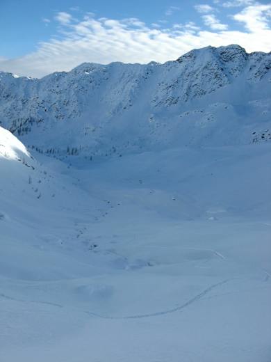 Im oberen Teil des Lärchenschlages am besten nicht den Spitzkehren gerade rauf folgen sondern immer links leicht ansteigend weiter bis man den Wald verlässt. Das kleine Plateau nun rechtshaltend verlassen und beim Wegweiser kurz abfahren und den Bach queren. Wir erreichen nun die Melenböden, hier gibt es die Möglichkeit der markierten Skiroute zu folgen, bei sicheren Verhältnisse besser jedoch mehr rechts bleiben und der logischen Linie folgen.