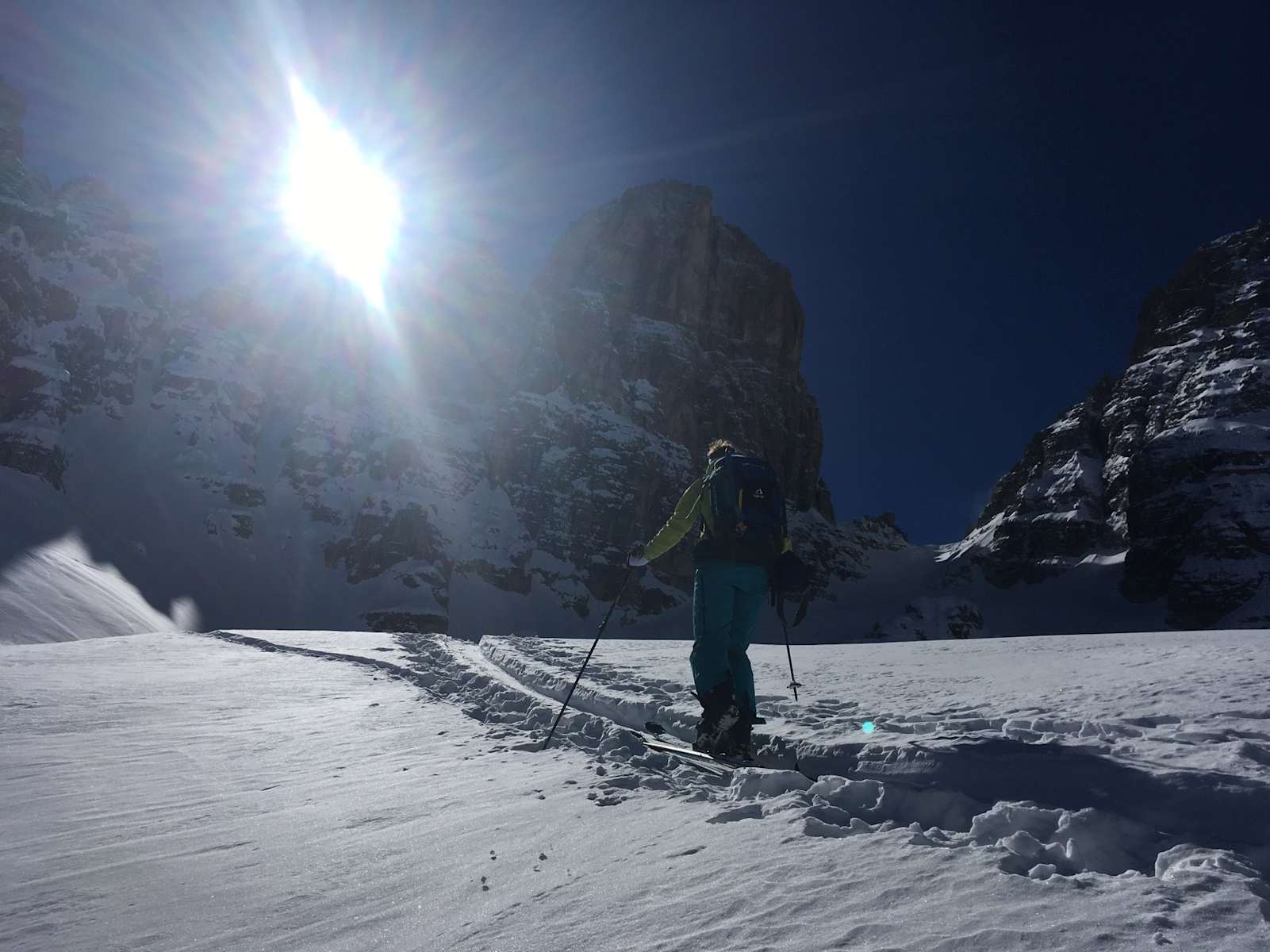 Nach der Rinne öffnet sich nun wie aus dem Nichts der Circo del Cristallo – ein sehr weitläufiges, optimales Skigelände inmitten des wunderbaren Dolomitenpanoramas. Kurz darauf sieht man die Scharte selbst – doch der Schein trügt, die Tour ist ab der Rinne noch recht lang.