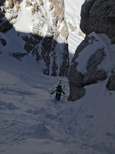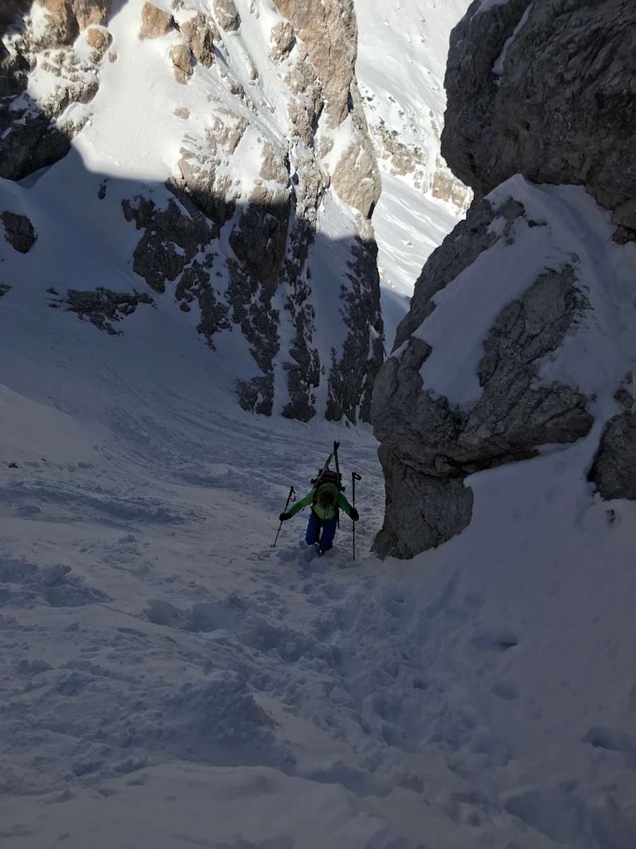 Die Rinne ist 40-45° steil und je nach Verhältnissen kann man sie mehr oder weniger weit mit den Skiern begehen, braucht Steigeisen und Pickel oder kann zu Fuß emporsteigen (Achtung bei Eis: Hier kann die Abfahrt anspruchsvoll werden!).
