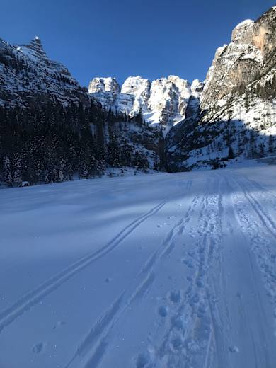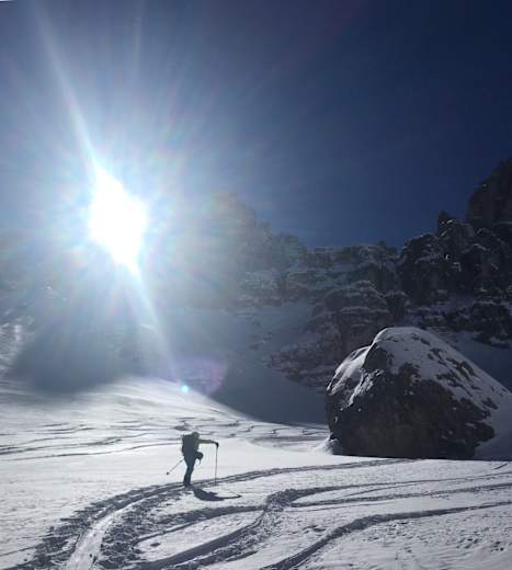 Von Misurina zur Cristallo Scharte (2.808 m): Eine durch ihre landschaftliche Schönheit, die Steilheit und durchgehende Abfahrt beeindruckende Skitour, die sich in den letzten Jahren zu einer der beliebtesten, anspruchsvolleren Klassikern in den Ampezzaner Dolomiten entwickelt hat.