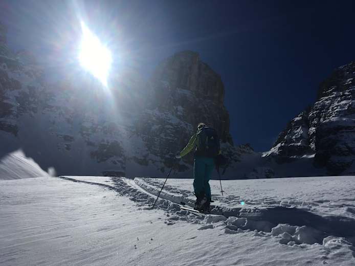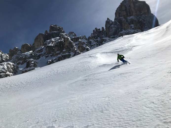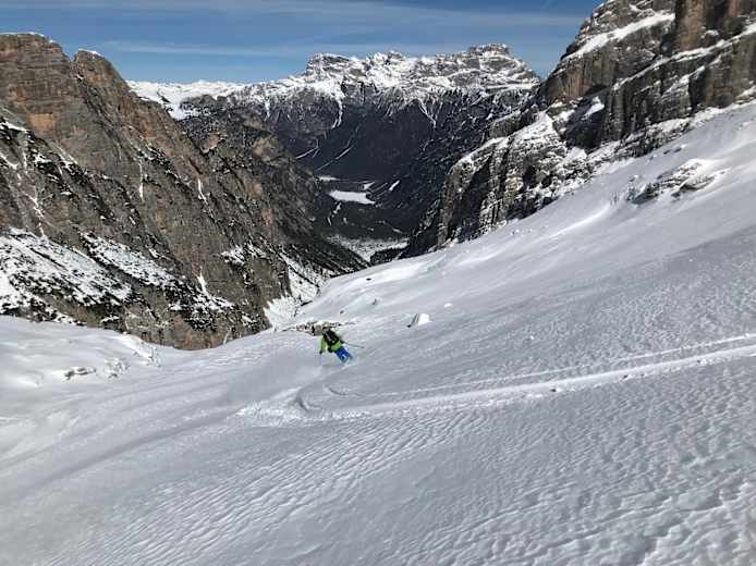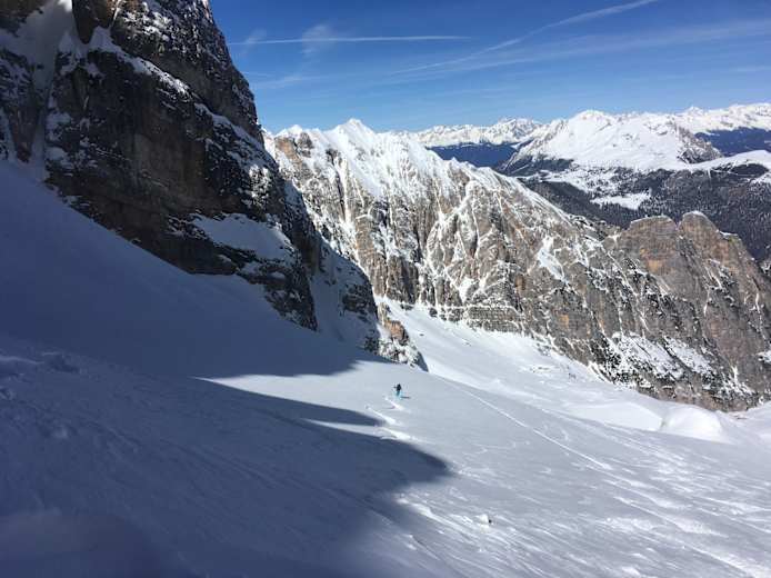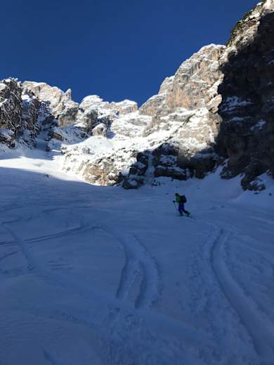 Abfahrt – die Spuren enden wieder in der Schlüsselstelle Foto: Riki Daurer Blick am Beginn zum Eingang ins Val Fonda Foto: Riki Daurer Abfahrt im oberen Bereich Foto: Bernhard Daurer Ideales Abfahrtsgelände von der Cristallo Scharte Foto: Riki Daurer Talboden vor der Schlüsselstelle, die sich links befindet Foto: Riki Daurer Die Schlüsselstelle/ Rinne bei sehr guten Verhältnissen Foto: Riki Daurer Blick zur Cristallo Scharte Foto: Bernhard Daurer Aufstieg im breiten Kar nach der Schlüsselstelle Foto: Bernhard Daurer Bildergalerie (8)