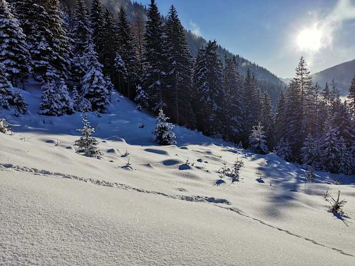 Bei festem, gut gesetztem Schnee führt die anstrengende Überquerung ohne nennenswerte Höhenveränderung auf den Kamm der Roten Wand. Ist der Schnee jedoch weniger stabil, sollte man unbedingt absteigen und die Westseite der Wand umkreisen, um die sicherere Südflanke zu erreichen.