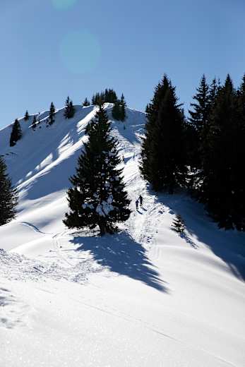 Die Tour geht konstant moderat über freie Hänge und durch kurze Waldabschnitte hinan. Dass man die Orientierung verliert, muss man nicht befürchten. Hier finden sich wirklich stets ausreichend Spuren.