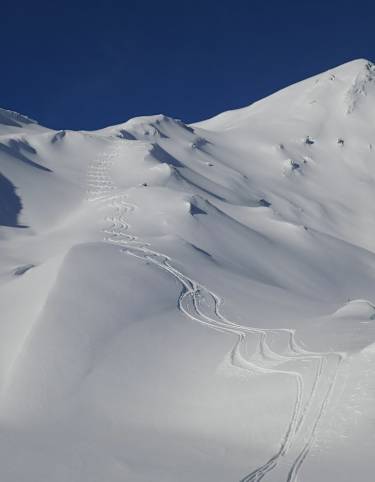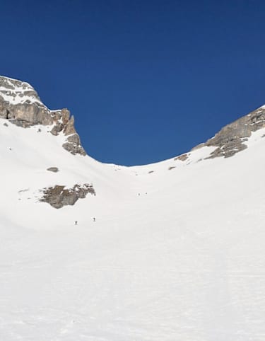 Beste Befahrungszeit ist das Frühjahr, nachdem alle Lawinen in der Stilonschlucht schon abgegangen sind und nachdem sich die harten Schneebrocken gesetzt haben. Harscheisen mitführen