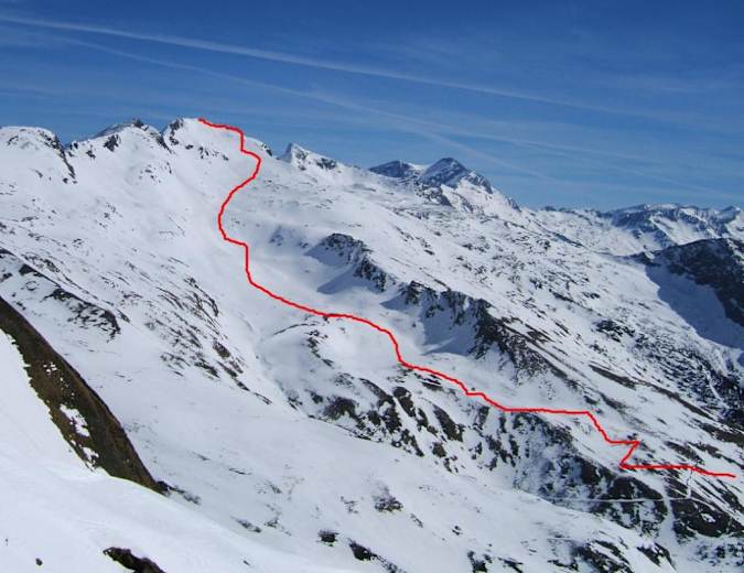 Entlang der Aufstiegslinie. Der steile, direkte Gipfelhang ist nur bei sehr sicheren Firnverhältnissen möglich, sonst besser im Sinne der Abfahrt links (im Bereich der Aufstiegsspur) halten! Vom Parkplatz Jamnigalm entlang der Fahrstraße (Rodelbahn) bis zur Stockerhütte.