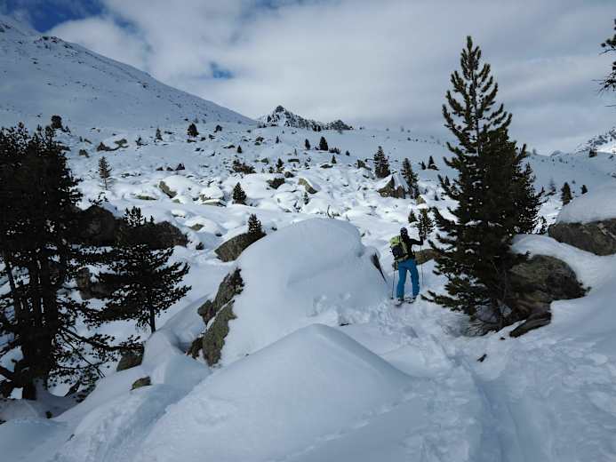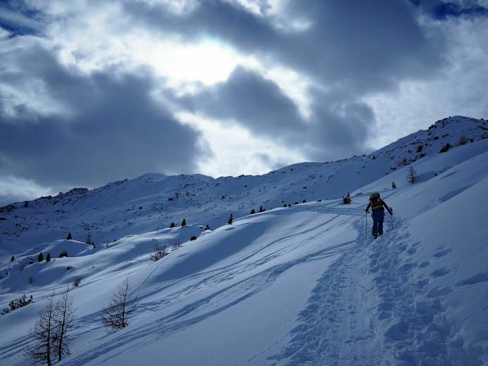 Schöne nordseitige Skitour im Val Müstair, Engadin, Kanton Graubünden. Aufgrund der Forstwege zu Beginn, kann die Skitour auch bei geringerer Schneelage begangen werden.