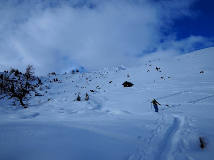 Weiter in südlicher Richtung durch lichten Wald und Waldschneisen aufwärts zum Beginn eines kleinen Hochtals. Geradeaus aufwärts zu der kleinen Holzhütte „Era da la Bescha (2.200 m)“.