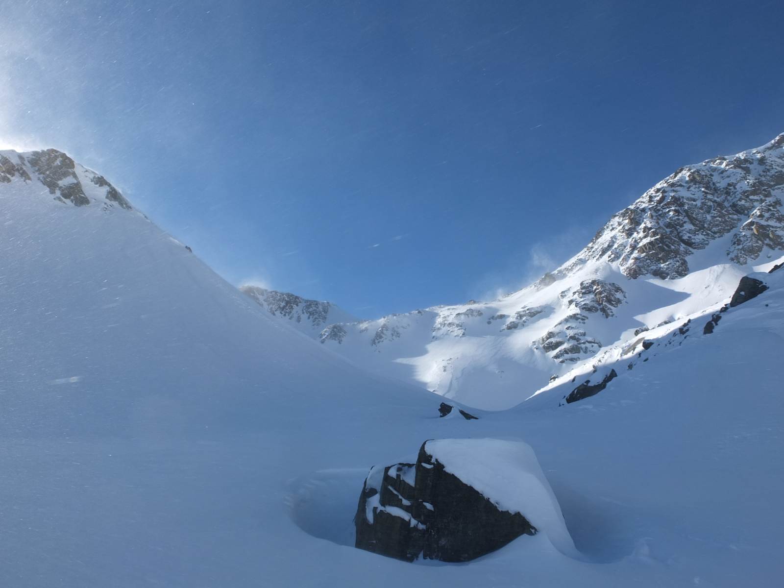 Einmal auf der Schulter, überquert man diese nach Süden und wendet nach Südwest. Man quert recht flach einen langen und im oberen Teil steilen Hang oberhalb eines Felsbandes. Diese Passage mündet in eine große „Mulde“, die dann gegen Westen wieder steiler zu einem Übergang (Schwarzhornfurgga) führt: nach Norden der Grat zum Schwarzhorn, nach Westen ist eine Abfahrt nach Teufi möglich.