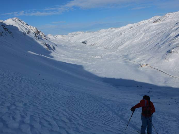 Im Winter wird die sonst recht direkte und kurze Tour durch einen längeren Anstieg von Tschuggen (Straßensperre) um einige Kilometer verlängert. Die Orientierung ist in diesem ersten Teil recht einfach, folgt man doch stetig der verschneiten Flüelapassstraße bis zum Hospiz.