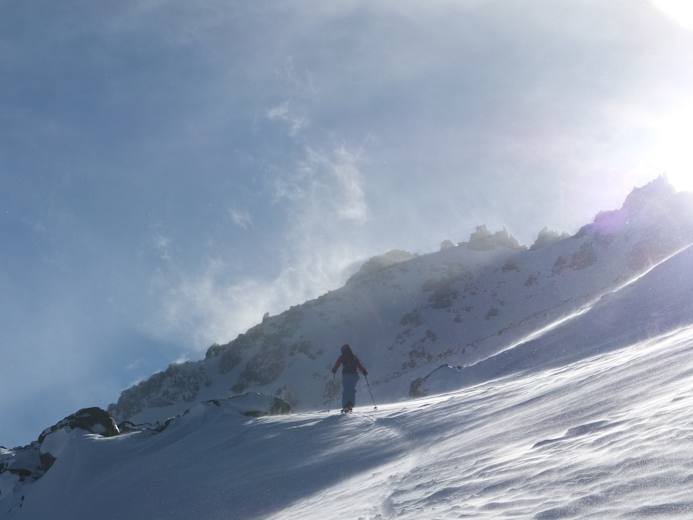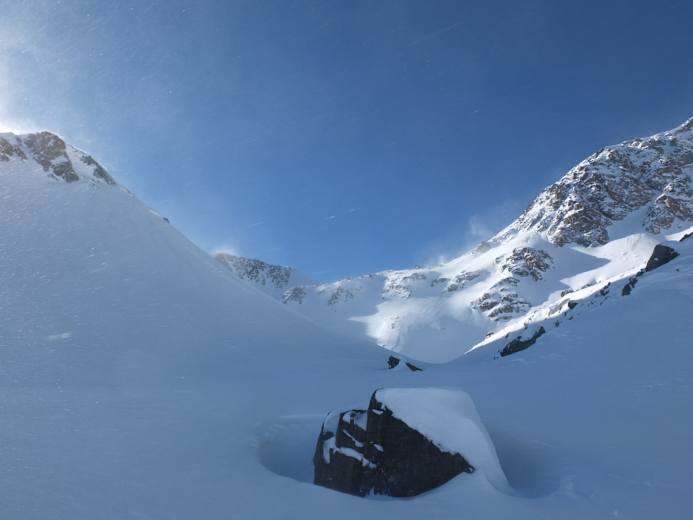 Auf der Furgga ist dann auch meistens Skidepot. Der Aufstieg über den Grat ist technisch nicht schwierig, Winde können aber an dieser Kante heftig sein. Der Ausblick vom Grat und vom Gipfel (3.147 m) entschädigt für vieles.