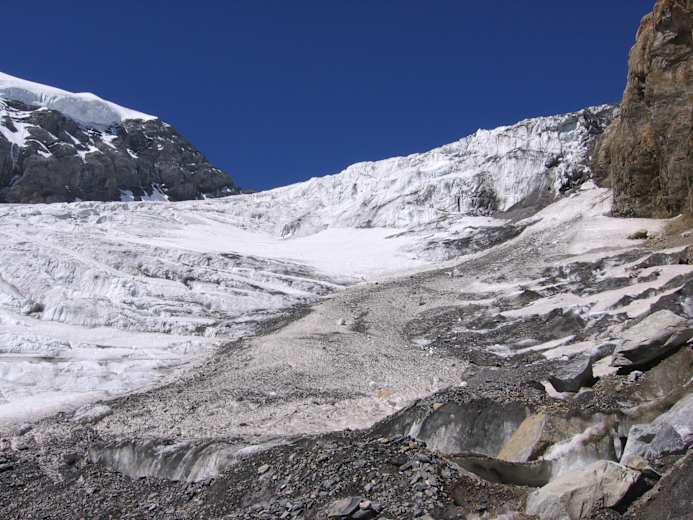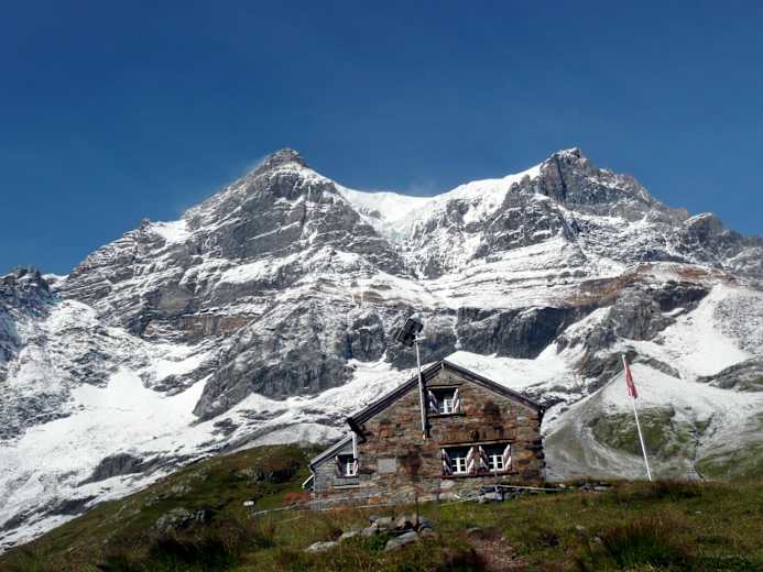Sanft ansteigend geht es zur Seitenmoräne, welche an einer geeigneten Stelle überschritten wird. Wenig später ist die Fridolinshütte erreicht.