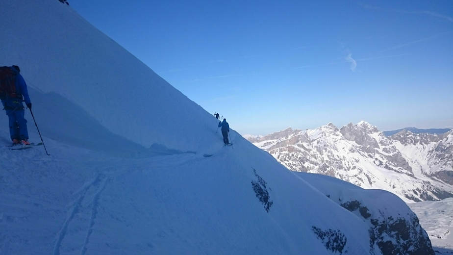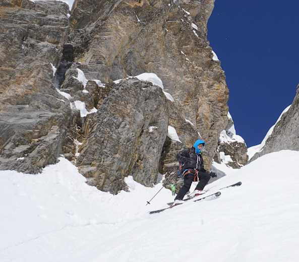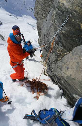 Sehr aufwendige Skihochtour, die sichere Verhältnisse und ein gutes Seilhandling verlangt. Zudem ist die Orientierung bei der Abfahrt nicht immer ganz leicht. Aus diesen Gründen ist die Buchung eines Bergführers auf jeden Fall empfehlenswert.