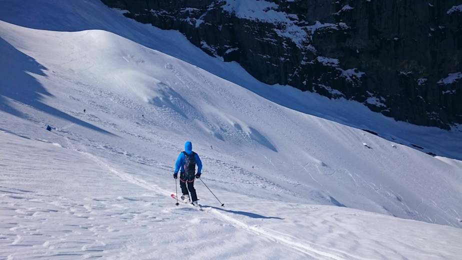 In weiterer Folge fährt man über Schwarzer Berg ab und steigt über den Punkt 2.301 m zum Biwak am Grassen auf 2.650 m an. Westlich unter dem Tierberg vorbei geht es nun über lange steile Hänge hinuter, über Gorisegg und Firnalpeli ins Tal nach Herrenrüti. Die Routenfindung ist nicht immer ganz einfach.