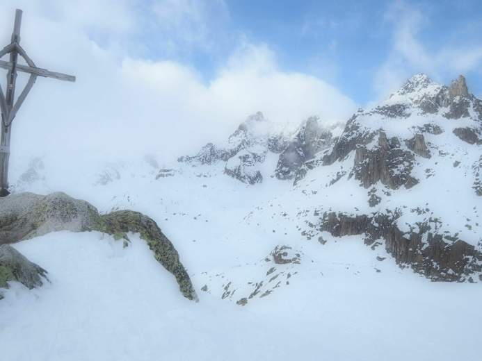 Vom Gipfel leicht abwärts und über einen einfachen Grat in wenigen Minuten zur Scharte unterhalb der Hütte. Ein kurzer Gegenanstieg und man erreicht in wenigen Minuten die Hütte.