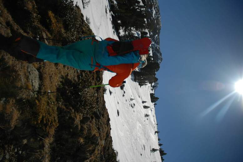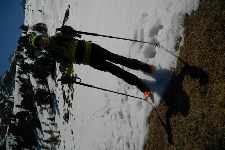 Für diese Variante muss man ebenfalls um die Bergstation herum aufsteigen und dann den teilweise ausgesetzten Grat mit Stangenmarkierung nach Westen folgen.