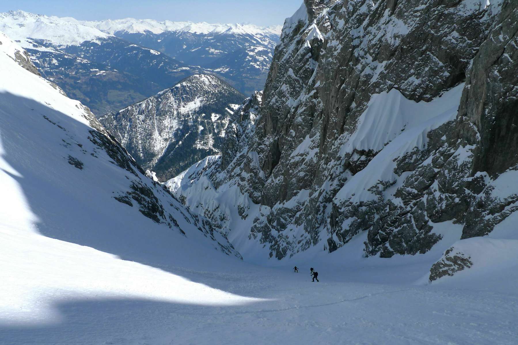 Die Rinne hat im Frühjahr oft feinsten Firn. Aufzupassen ist aber die tageszeitliche Erwärmung die zu späterer Stunde immer wieder Nassschneelawinen in die Arlingriese abgehen lässt.