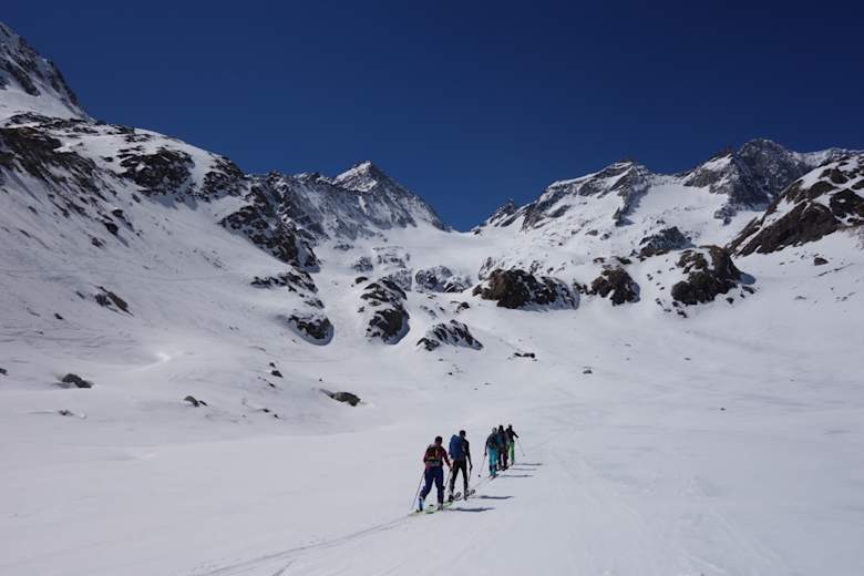 Die Abfahrt verläuft entlang der Aufstiegsroute zum Stredacher Winkel und von dort zurück zur Essener-Rostocker Hütte.
