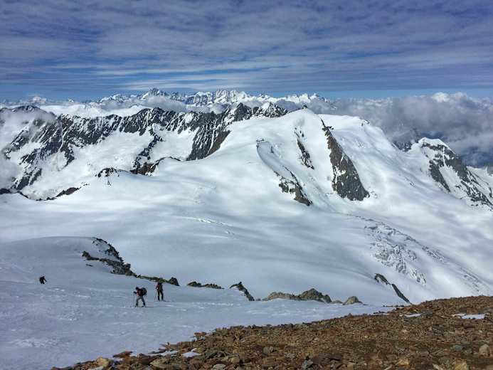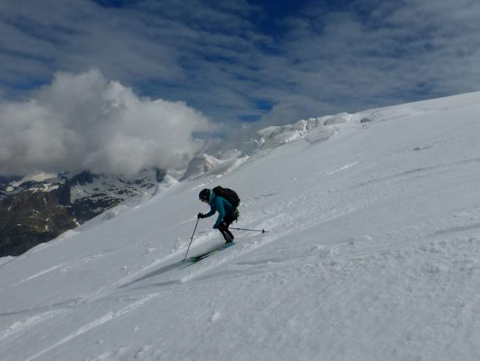 Die Abfahrt folgt weitestgehend der Aufstiegsspur, wobei der schöne Gipfelhang viel Platz für eigene Spuren lässt. Auch hier jedoch gut auf die vorhandenen Spalten achten.