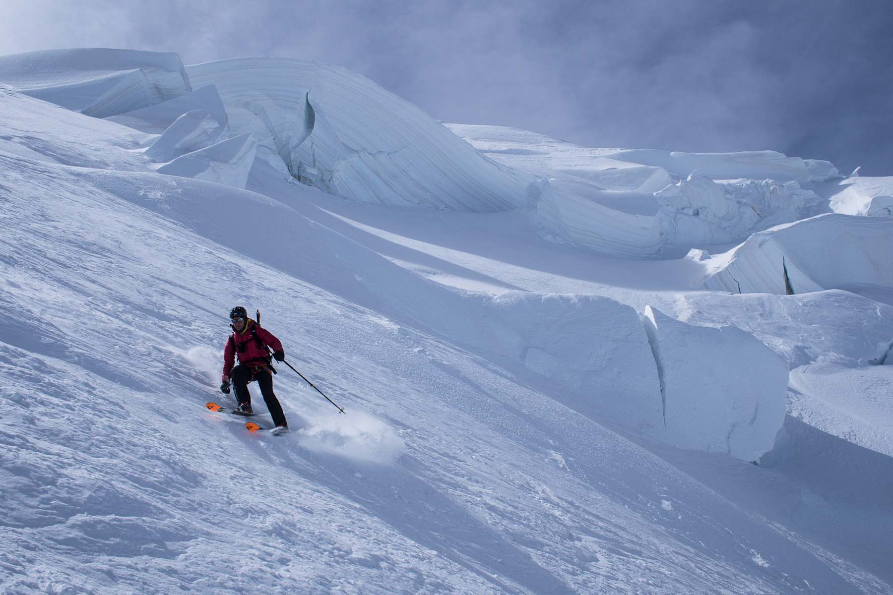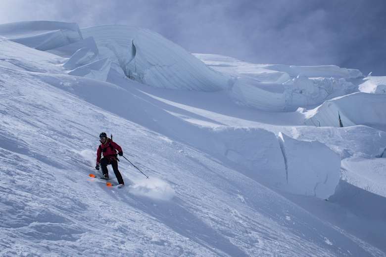 Nach kurzer Gipfelrast führt die Abfahrt über die steile Nordflanke. Die wild zerklüftete Gletschelandschaft mit den großen Seracs ist einzigartig und atemberaubend.