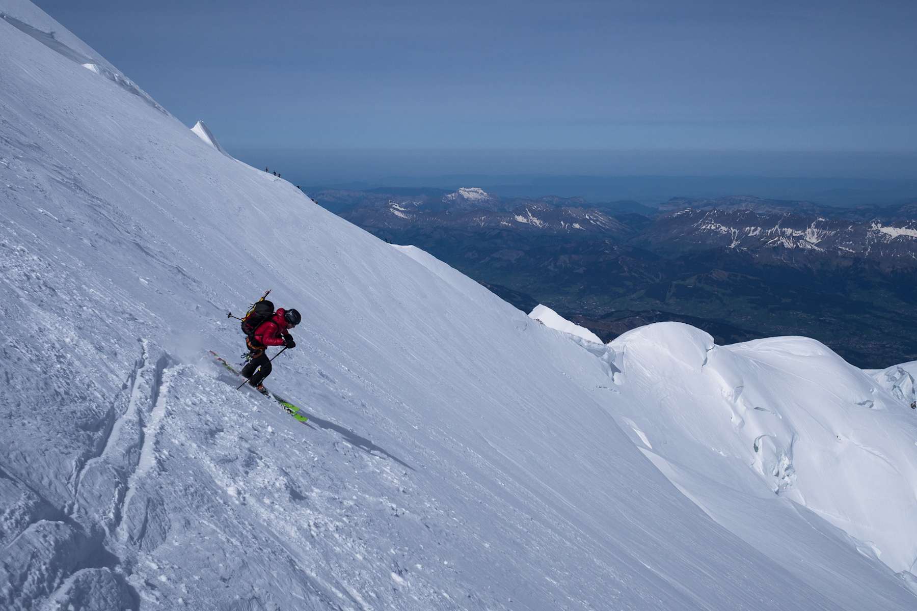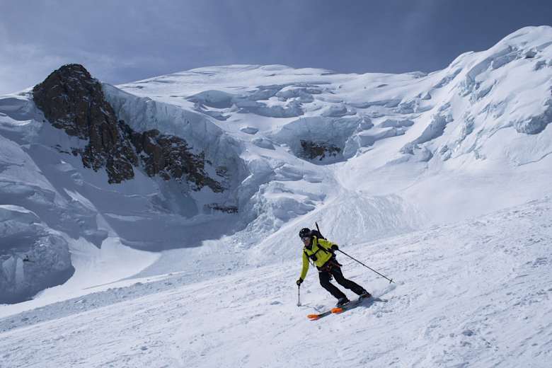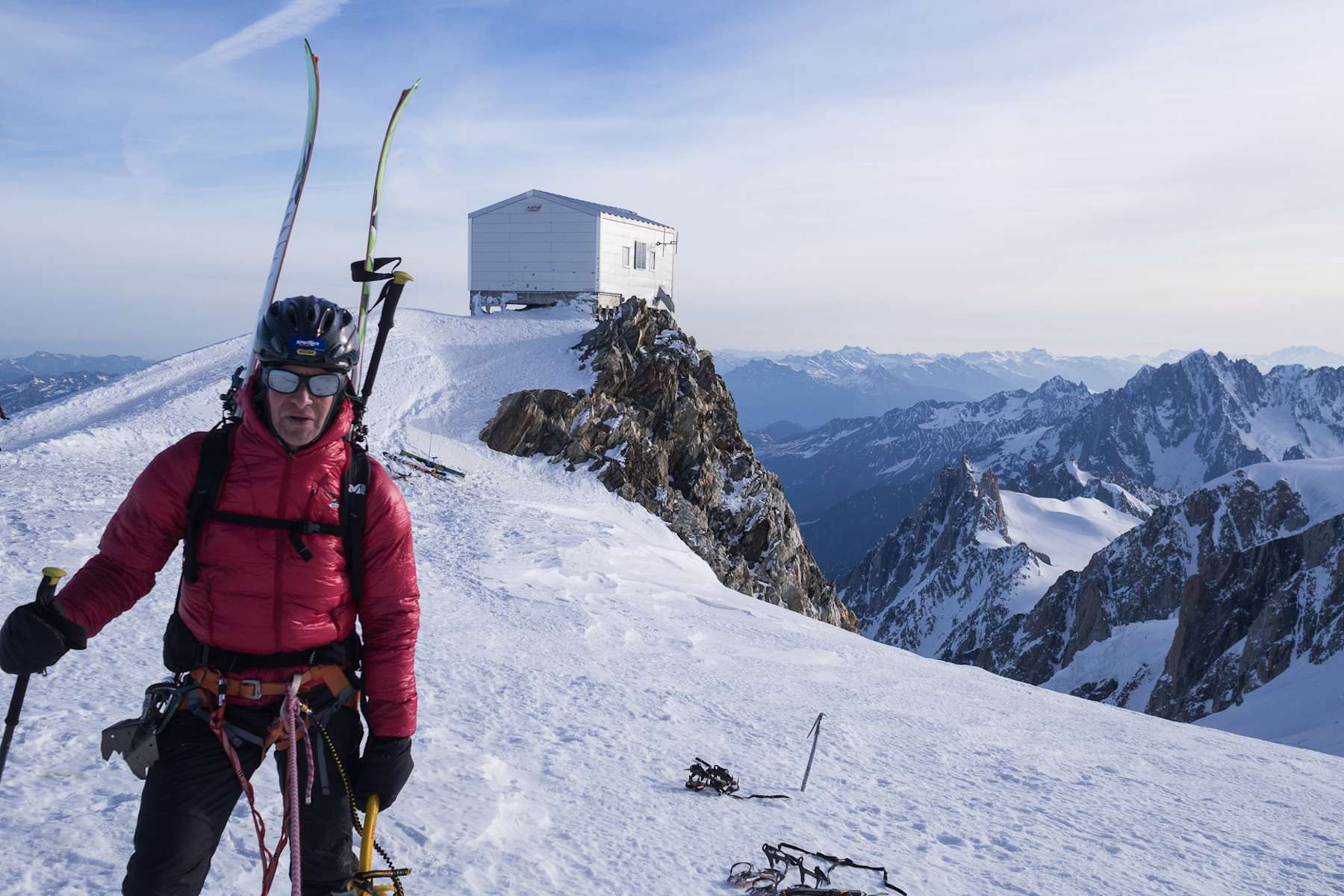 Sobald man den Col de Dome erreicht hat, folgt man der klassischen Route zum Vallot Biwak (4.362 m). Wer hier seine Ski deponieren möchte, für den geht es nun zu Fuss über den teils ausgesetzten und windanfälligen Bosses-Grat hinauf zum Gipfel.