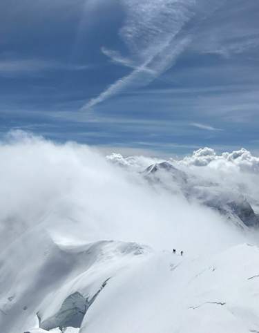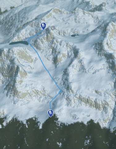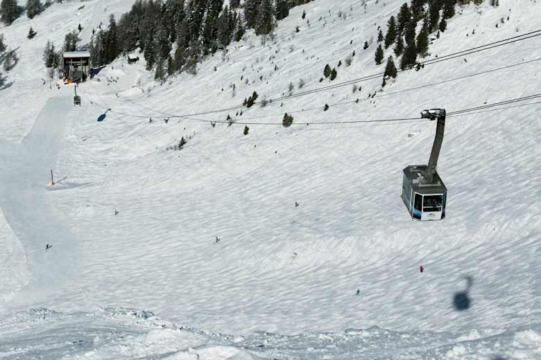 Nach dem Ausstieg hält man sich Richtung Nord-Nord-Ost und traversiert den Hang Richtung Le Basso d´Alou (2.337 m) möglichst ohne viel an Höhe zu verlieren. Nach einigen Metern kommt man in steileres Gelände und sucht sich eine schöne Linie zur einsehbaren Talstation der Seilbahn.