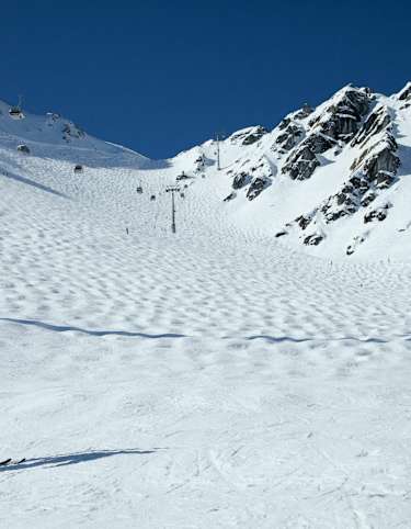 An der Bergstation der Mont Fort-Seilbahn linker Hand über die markierte Piste abfahren. Etwa auf der Hälfte der Seilbahnstrecke quert man die Lifttrasse und gelangt über die rote Piste "Glacier 2" zurück zur Talstation.