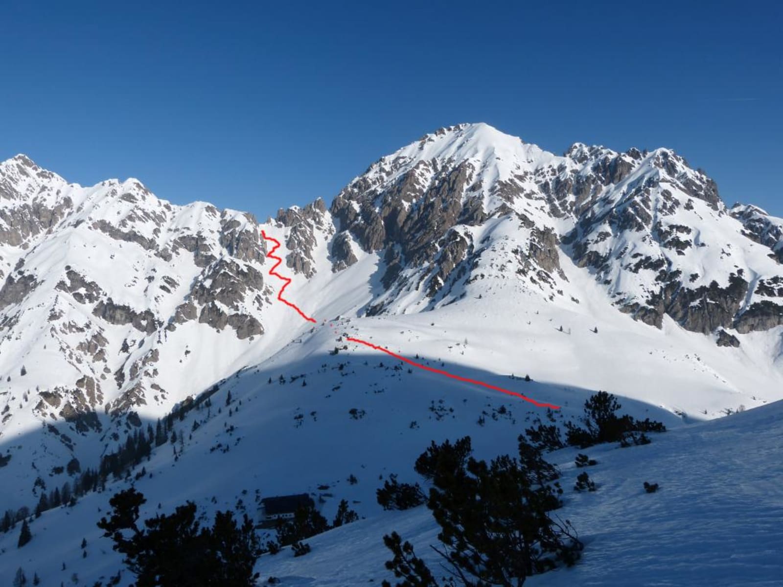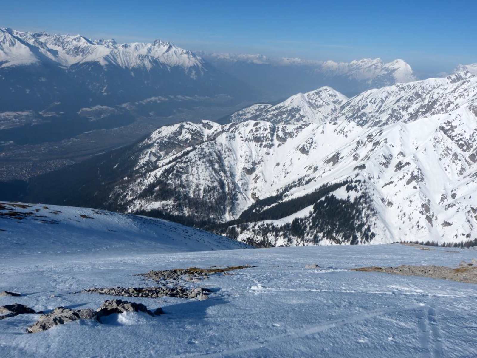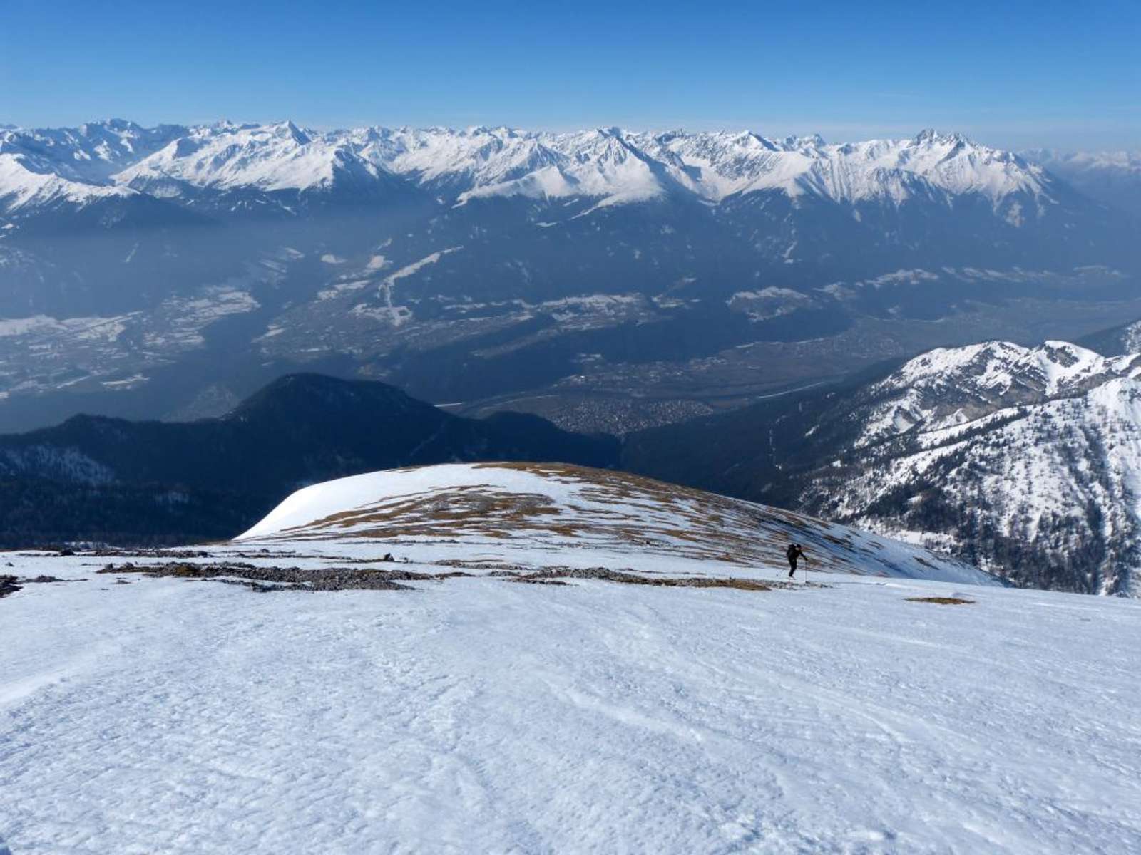 Lohnende Frühjahrsskitour auf den weithin sichtbaren Großen Solstein (2.506 m) hoch über dem Inntal. Oft muss man am Gipfel den perfekten Abfahrtszeitpunkt abwarten und kann währenddessen den herrlichen Ausblick ins Karwendelgebirge und zu den Stubaier Alpen genießen. Insgesamt eine empfehlenswerte und lange Skitour in Tirol.