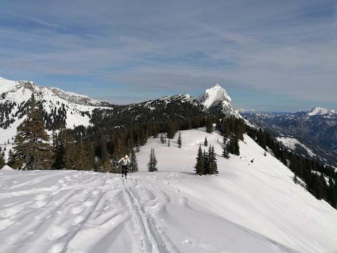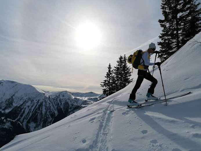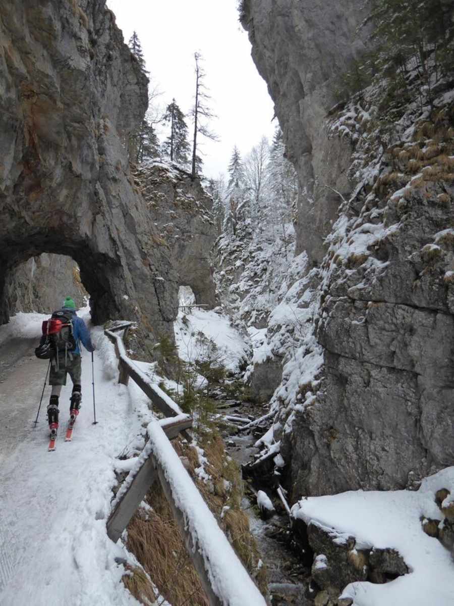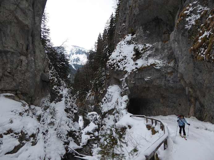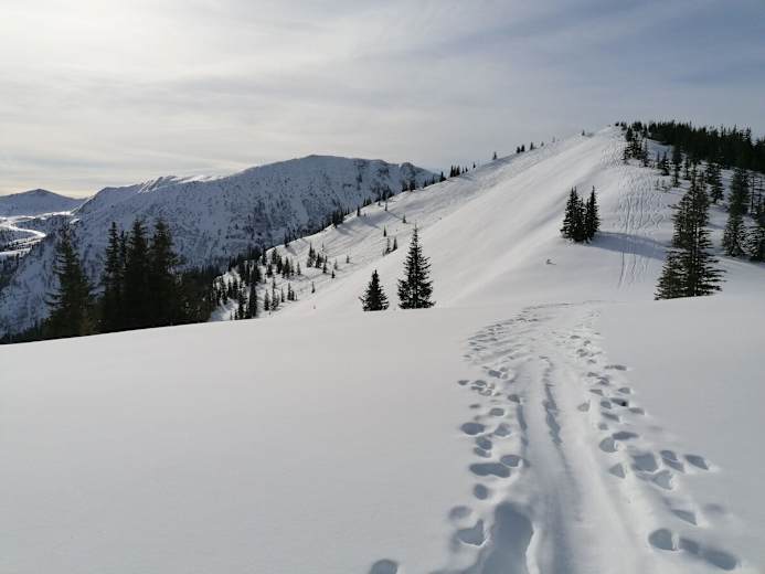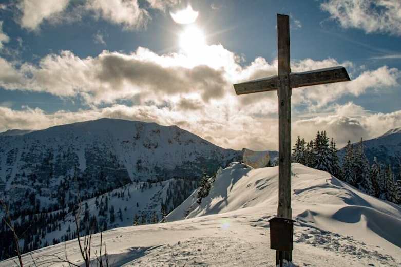 Am Beginn der Forststraße und abschnittsweise im Bereich der Klamm ist mit aperen Stellen zu rechnen, die bei der späteren Abfahrt unnötige Kratzer auf der Skilauffläche verursachen können. Zuerst folgst du der Forststraße durch die berühmte und sehenswerte Ebner- oder Teufelsklamm. Hinter der Klamm führt die Strecke über die Rodelbahn , bald biegen wir Links ab und es geht abwechselnd durch den Wald und abschnittsweise wieder auf Forststraßen in Richtung Gipfel. Folgst du den Wegweisern in den Wald, kommst du bald über eine kleine Steilstufe an eine Lichtung. Wenig später folgt der gespurte Weg einen längeren Abschnitt einer Forststraße, dessen Waldbereiche links (östlich) Lebensraum für Raufußhühner sind und daher nicht betreten werden dürfen (entsprechende Hinweistafeln kennzeichnen dies deutlich). Am Ende der Forststraße erreichst du in einem kurzen Steilstück einen flachen Rücken und kommst direkt zum Beginn des Gipfelhanges. Den Spuren in südöstlicher Richtung folgend, gehst du nun an einer Wetterstation vorbei und über mehrere Spitzkehren hinauf zum Gipfelkreuz (1.788 m).