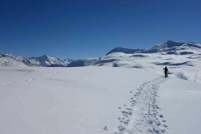Hier hat man nun eine wunderschöne Hochebene vor sich, die man überquert. Eventuell kann man die Felle herunternehmen, dann das Gelände ist leicht fallend.