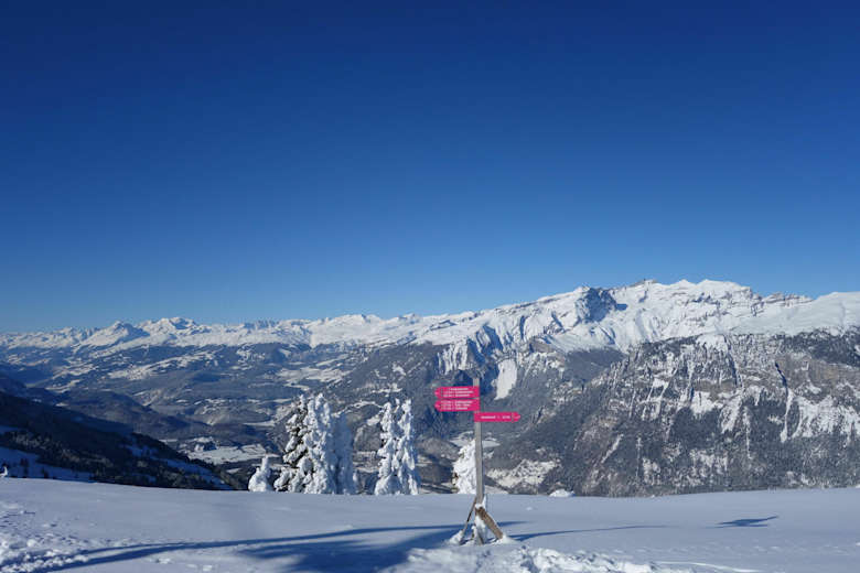 Ab der Bergstation Brambrüesch geht es anfangs durch den Wald und über einige Lichtungen aufwärts. Etwas später folgt man dem Verlauf der Skipiste an deren rechten Rand hinauf zum Furggabüel und zum Dreibündenstein.