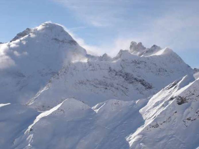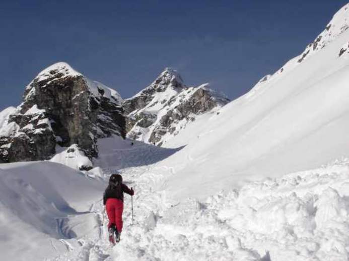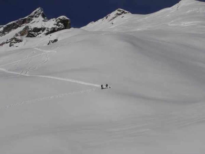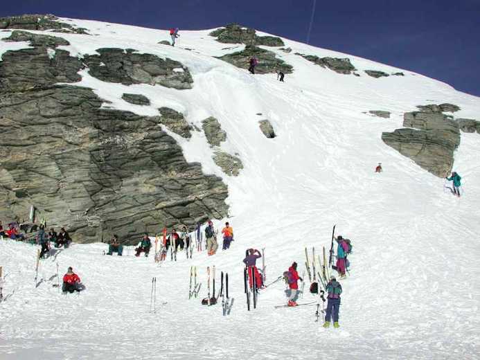 An der Scharte wird meist ein Skidepot eingerichtet und die letzten Meter zum Gipfel (2.699 m) werden zu Fuss überwunden.
