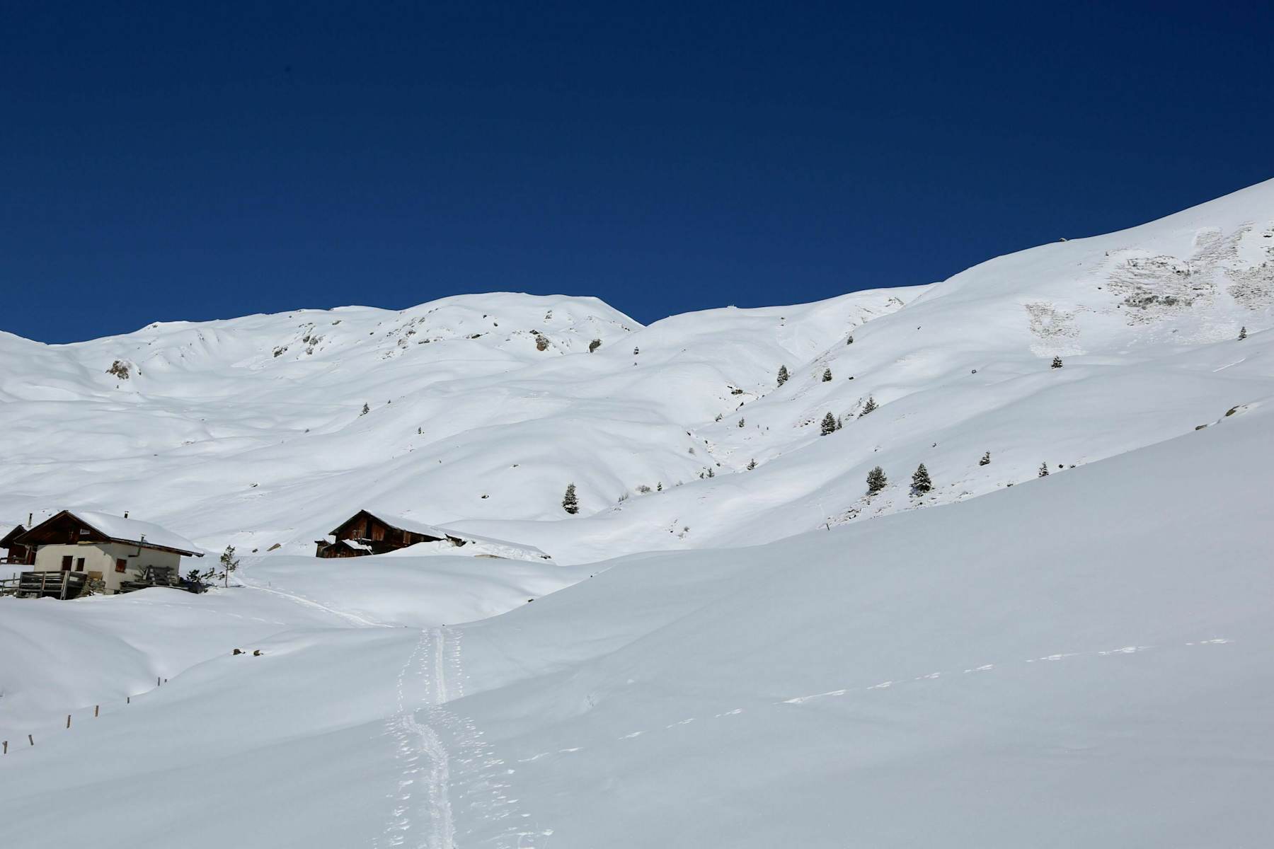 Mit einer rasanten Tiefschneeabfahrt erreicht man bald die Geiselhöfe auf 1.645 m. Bei weniger guten Verhältnissen kann man auch übers Eiskarjoch und den Eiskarsee abfahren. In den Geiselhöfen kann man sich von Heidi bewirten lassen und hat Zeit, die Skidurchquerung noch einmal Revue passieren zu lassen.