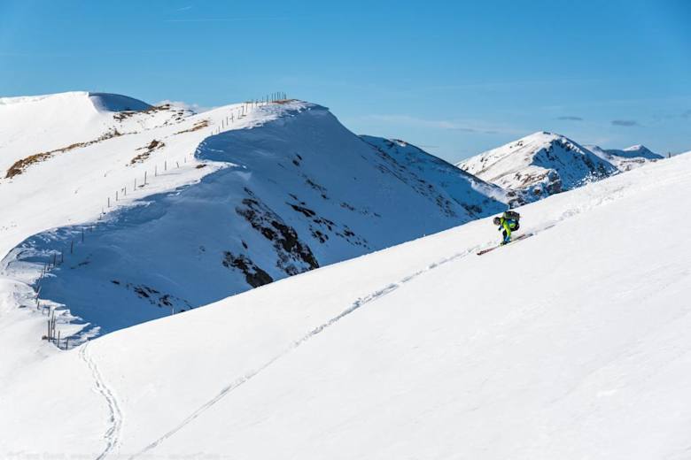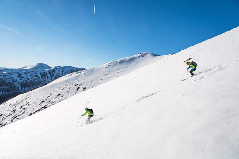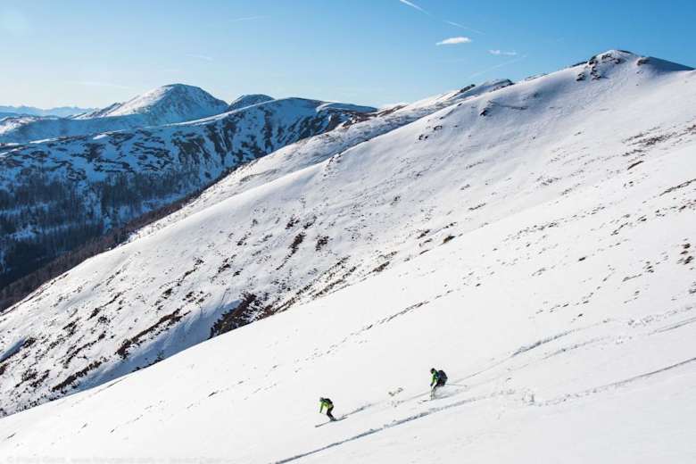 Ist der Gipfel erreicht, wartet zum krönenden Abschluss eine endlos lange Skiabfahrt bis hinunter nach Bad Kleinkirchheim. Zunächst wedelt man über die sanfte Südwestflanke des Mallnocks bis zur Bergstation der Brunnachbahn.