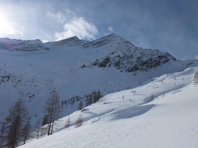 Auf 1.700 m Seehöhe wechselt man über das Bachbett nach Norden. Hier wird der Wald sehr licht und bald hat man freie Hänge vor sich. Nun wird die Orientierung wesentlich leichter: auf der rechten (nördlichen) Seite begrenzt der mächtige Ostgrat des Piz D’Arbeola den Weg, auf der linken (südlichen) Seite das Bachbett. Man schließt also gegen den Hang nach Westen auf und zielt auf eine Lücke im Felsspalier: Bocca de Rogna (2.400 m).