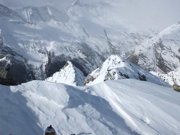 Dieser Hang ist schön kupiert und nie besonders steil. Nach mehreren Spitzkehren stehen wir auch schon auf dem windexponierten Gipfel (2.689 m) mit Blick ins Tessin.