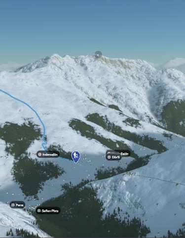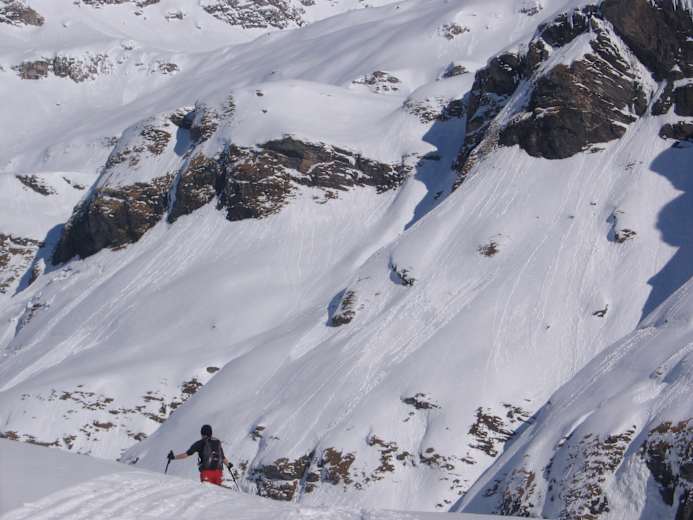 Die Abfahrt ist bei guten Verhältnissen ist ein Traum. Im Frühjahr muss die ost-seitige Neigung bis zur Stutzalpe berücksichtigt werden.