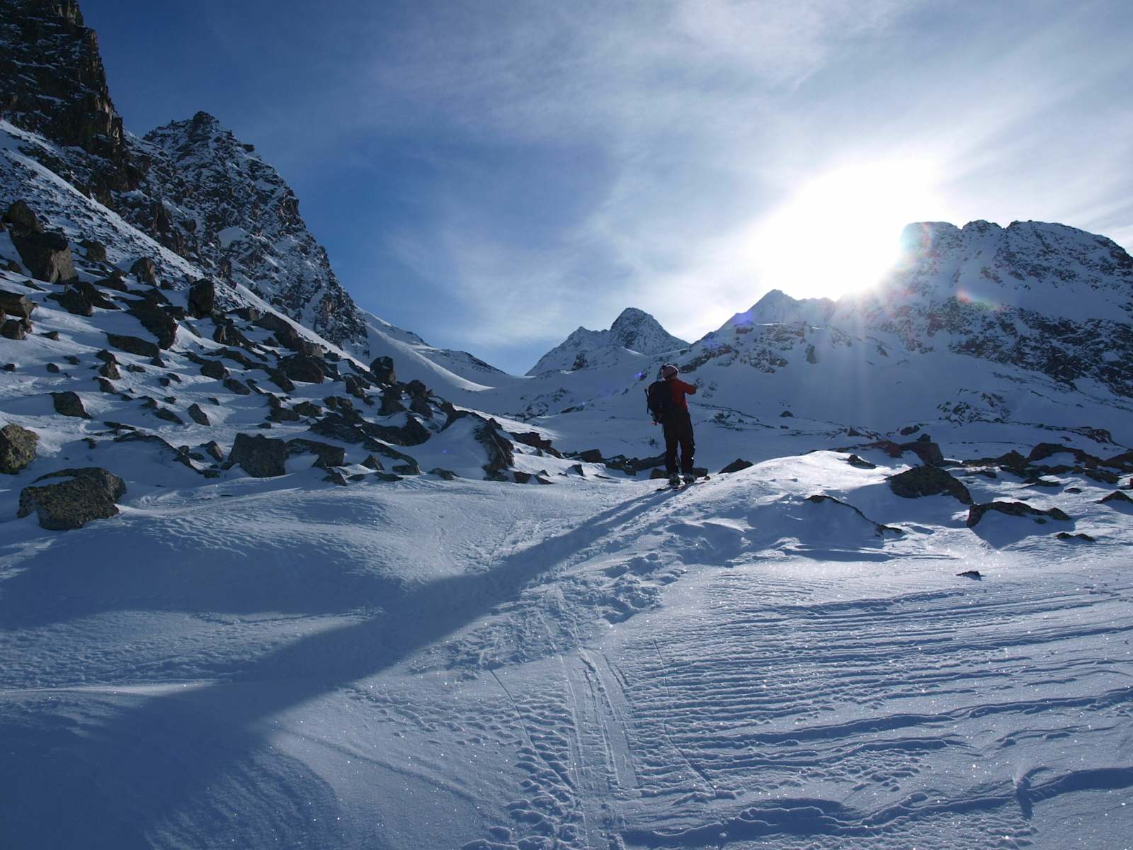 Die Route verengt sich zunehmend, die Landschaft wird sehr alpin und gegliedert. Über eine kleine Lücke geht es auf den winzigen Schwarzhorngletscher, dann weiter den Felswänden entlang bis zum Surettajoch. Hier ist meist Skidepot.