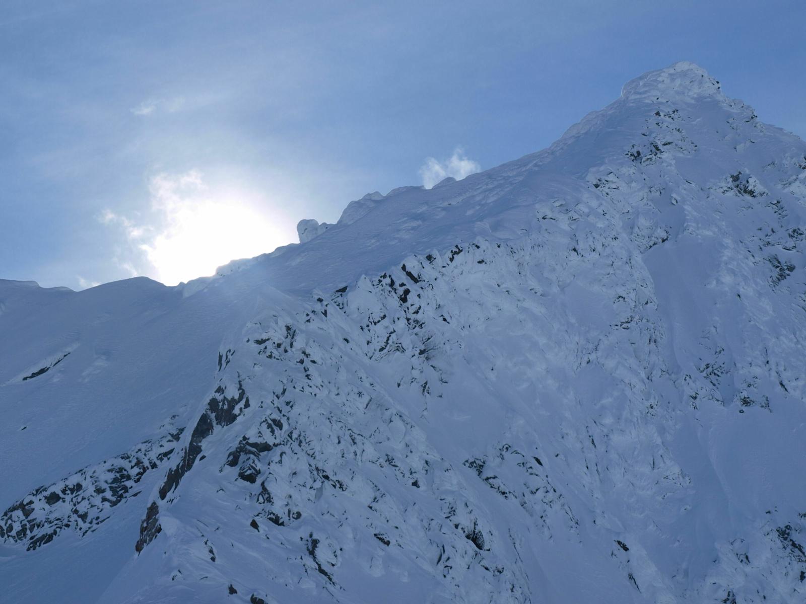 Den letzten Part des Aufstiegs begeht man meist mit kleinem Pickel - der Hang ist steil, das Schneeprofil sollte für den Aufstieg passen. Der direkte Weg über den Grat ist nicht ratsam, sondern etwas südlich davon im Hang.