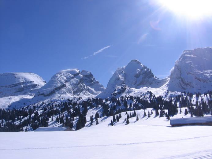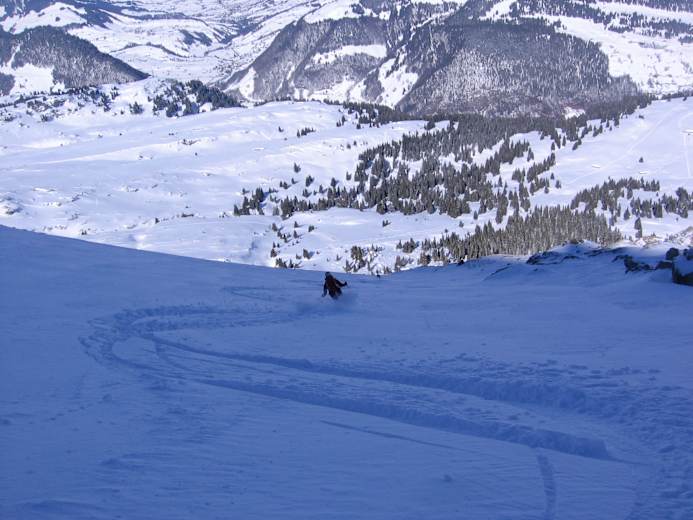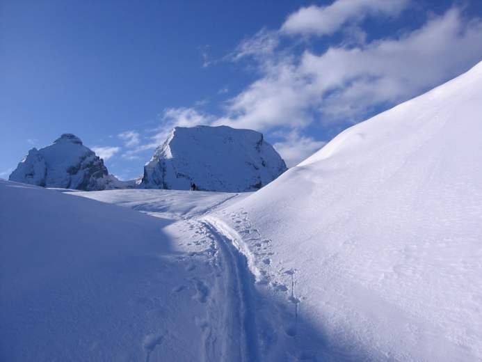 Die grandiose Abfahrt folgt dem Aufstieg. Der Hang erfordert aber eine sichere Skitechnik, da manche Stellen exponiert sind.