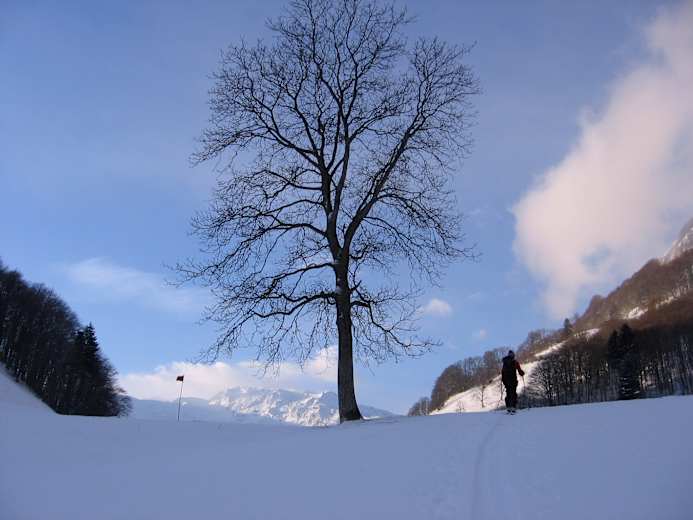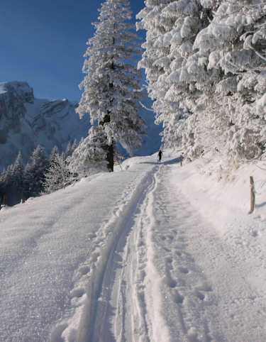 Von nun an folgt man mehr oder weniger dem Wanderweg nach Maienberg, auf der Brücke über den Luterbach und weiter steil zum Lanaberg. Vom Skihaus führt die Trasse, meist ist eine gute Skispur vorhanden, geradewegs den Walserberg hoch zum Berghaus Gonzen.