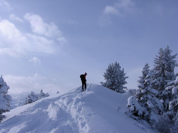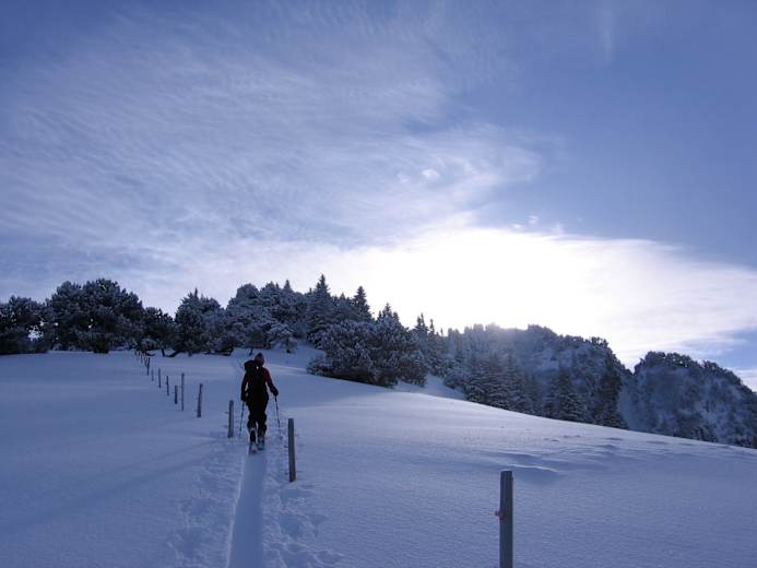 Nach dem Berghaus teilt sich die Skispur meistens, eine führt zum Tschuggen und eine zum Gonzen: die linke. Es geht also gegen Süden zu den Rieterhütten, dann einen Karrenweg folgend oder die Kehren abkürzend zu einer Einsattelung (Folla).