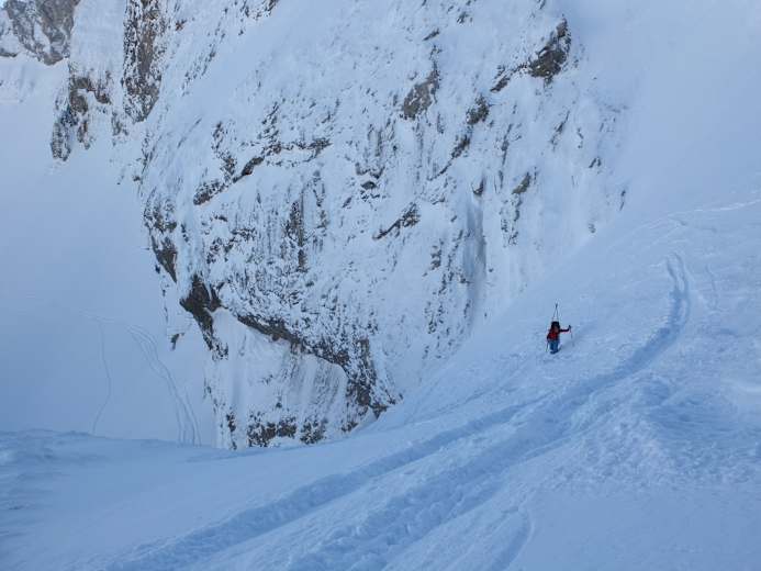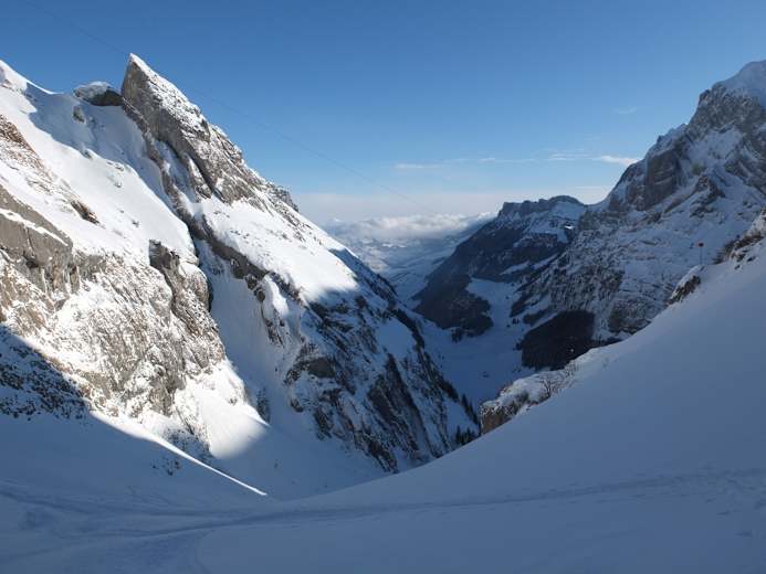 Dieser breite und eher sanfte Abschnitt verengt sich mit zunehmend steiler werdenden Höhe bis zum Gasthaus Alter Säntis, wo man schließlich die Felle von den Ski abnimmt. Durch die Bergstation gelangt man innerhalb weniger Minuten zum Gipfel.