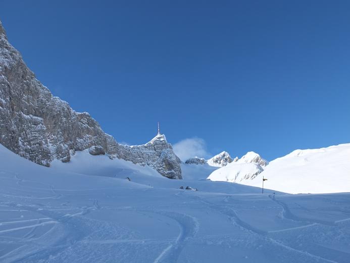 Säntis (2.502 m), der König der Ostschweiz. Grandiose Skitour im Kanton Appenzell Innerrhoden für jeden, der den Abfahrtsrummel um sich vergessen kann, aber Steilstufen und Spitzkehren liebt.