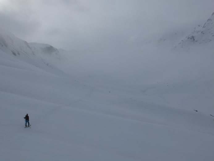 Auf ca. 2.800 m Seehöhe schwenkt man wieder nach Süden und sieht zum ersten Mal den Gipfelaufbau des Piz Albris.