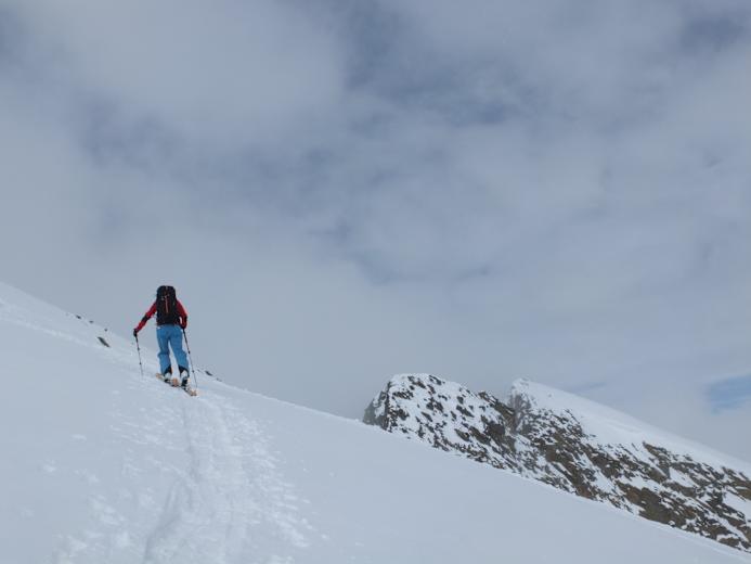 Seine Nordwestflanke ist felsdurchsetzt, der Anstieg über Nord ist aber nur mäßig steil und bis zum vorgelagerten Gipfle am Südostgrat gut machbar. Hier ist auch meist das Skidepot. Zum Gipfel über denselben Grat geht man nur bei günstigen Verhältnissen. Der Blick auf Piz Palü und Piz Bernina ist großartig und unmittelbar.