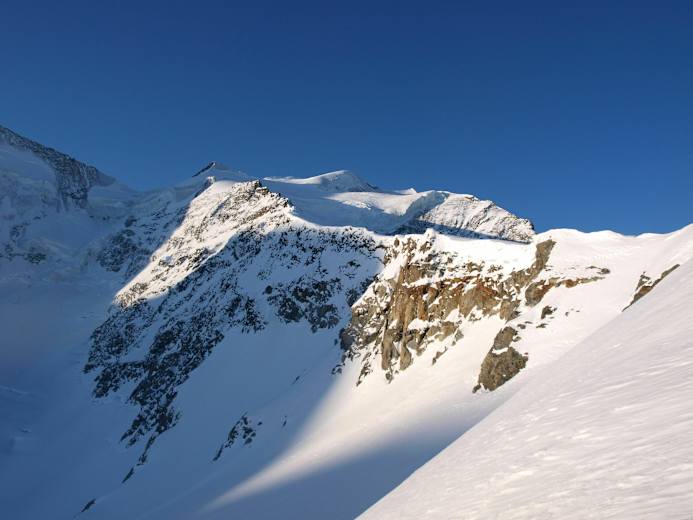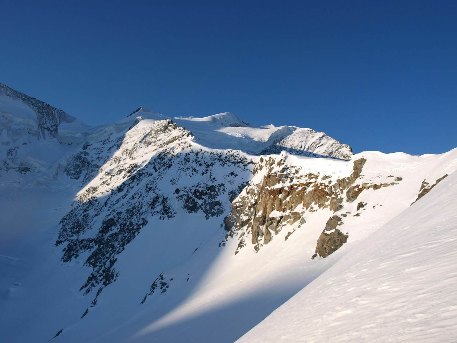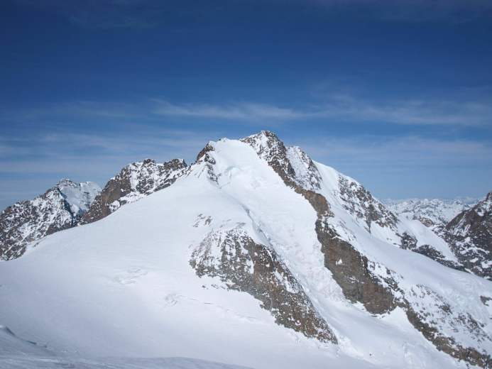 Im Falle eines plötzlichen Wetterumschwungs kann man hier das nahe gelegene Biwak Rifugio Marco e Rosa CAI (3.609 m) erreichen. Von der Fuorcla geht’s nun wieder hinauf zum Spallagrat. Unter den Fels wird das Skidepot errichtet. Nun geht’s zu Fuß (Steigeisen, Pickel) entweder direkt über den Grat zu Gipfel oder wenn die Schneeverhältnisse es erlauben, entlang des steilen Osthanges zum Gipfel.