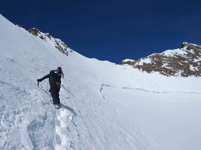 Man nähert sich weiterhin mäßig steil dem im Westen begrenzenden Felsgrat. In einem kleinen Schwenk nach Norden erklimmt man ein Joch in diesem Kamm (3.186 m), um diesen auf seiner Westseite gegen Süden und damit hinauf zur Fortezza zu folgen. Denkbar ist hier auch, etwas abzufahren und anstatt am Grat sein Glück zu suchen, etwas unterhalb durch einen steilen Korridor die Fortezza links liegen zu lassen und auf die Bellavista zu gelangen.